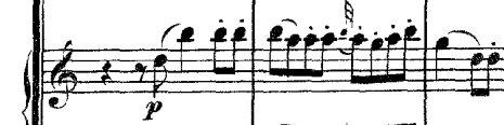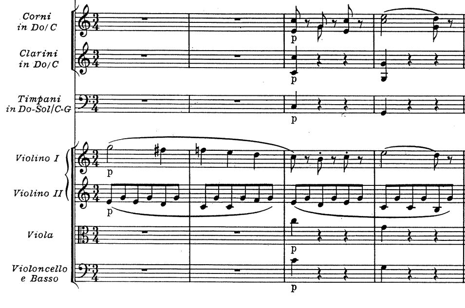 1st subject in typical Mozart style – Tonic established over two bars, with a quieter answering phrase for two bars, repeated in the Dominant, and then the movement gets underway.